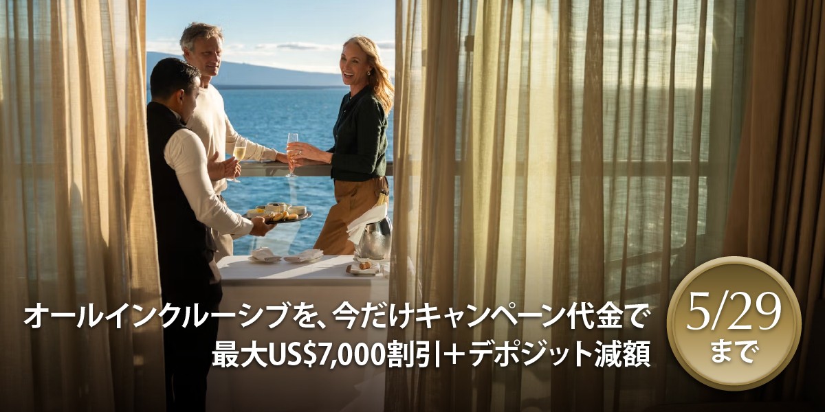 いまシルバーシー・クルーズをご検討中の方に、ぜひご覧いただきたいのが、5/29(金)までの期間限定でご案内する1室最大US$7,000割引+デポジット減額(通常25%→15%) の期間限定キャンペーンです。