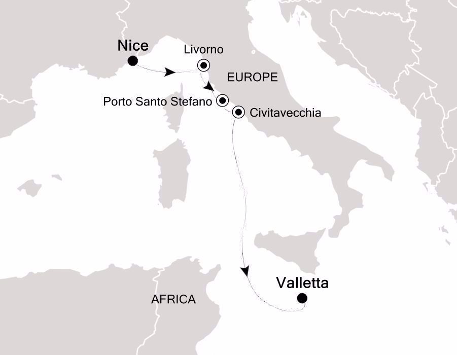 | <i Cruiseおすすめ①> シルバー・シャドーで航く 2026年7月13日出航 ※8/18出航逆コースもあり 西地中海(ニース~バレッタ/マルタ島)6泊7日 ラストミニッツ代金 US$2,950~ • なんとラグジュアリークルーズがUS$2,000代後半~ • リボルノでの1泊停泊を含み、トスカーナ観光も視野に入れやすい行程 |
